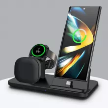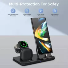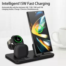 Simplify your charging routine with the 3-in-1 15W Wireless Charger Stand, designed exclusively for Samsung devices. This multifunctional charger powers your Samsung Galaxy S24, Galaxy Watch 7, and Buds Pro simultaneously, making it a must-have accessory for your desk or nightstand. With its sleek design and advanced safety features, it ensures efficient and reliable charging for all your essential gadgets.
