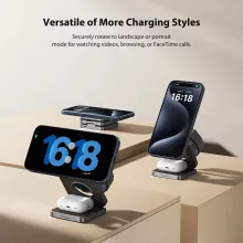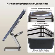 Whether you’re working, relaxing, or traveling, this charging station is designed to fit effortlessly into your lifestyle. Its foldable, magnetic design ensures it’s easy to carry and set up wherever you go. The anti-slip silicone base keeps it securely in place, while the frosted finish prevents scratches on your devices. Plus, with a dual-coil setup, you can charge your phone in either portrait or landscape mode, making it perfect for hands-free video calls or streaming.