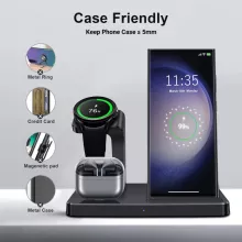 What sets this wireless charger apart is its ability to charge three devices simultaneously while maintaining a sleek and organized appearance. Its fast-charging capabilities and universal compatibility with Samsung devices ensure you never run out of power. The design caters to Samsung users specifically, ensuring seamless performance for phones, watches, and earbuds.