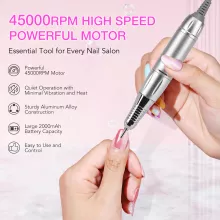 This electric nail drill is built with a powerful upgraded motor that runs smoothly at speeds up to 45,000 RPM. With an easy-to-use speed control knob, you can adjust the rotation to match any nail care need—gentle filing for natural nails or high-speed sanding for acrylics. Its versatility makes it the perfect companion for manicures, pedicures, and intricate nail art.