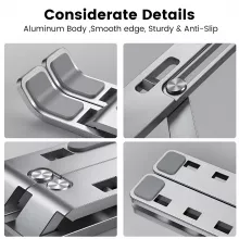 This laptop holder stands out due to its combination of style, durability, and practicality. Its ergonomic design promotes better posture, making it ideal for long hours of work or study. The aluminum construction not only adds elegance but also ensures long-lasting performance. Its foldable design means you can take it wherever you go, making it the perfect companion for busy professionals, students, and travelers.