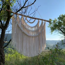 Bring warmth, texture, and personality to your home with this large handwoven macrame wall hanging. Designed in a modern boho style, it features a beautiful combination of creamy-white and yellow cotton rope intricately knotted into a striking pattern. At 31.5 x 31.5 inches, it’s the perfect statement piece for a bedroom headboard, living room wall, or creative studio backdrop. Suspended from a unique spliced round wooden stick, this tapestry exudes natural charm and artisanal craftsmanship.