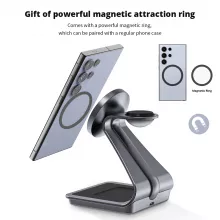 Unlike ordinary chargers, this magnetic charging stand is tailored for the Samsung ecosystem. It seamlessly integrates with magnetic cases or magnet rings, ensuring your devices stay securely in place while charging. The aluminum alloy and PC material construction provides durability and a sleek design that complements any setting—whether it’s your desk, living room, or nightstand.