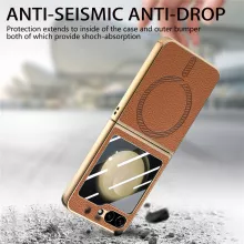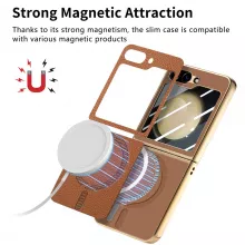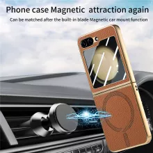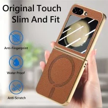 Elevate your Samsung Galaxy Z Flip 6/5 with this premium leather case that blends style, functionality, and robust protection. Designed to fit perfectly, this sleek cover not only safeguards your phone but enhances its sophisticated look. With its built-in MagSafe compatibility, wireless charging has never been easier or more seamless.