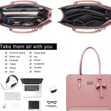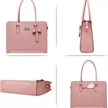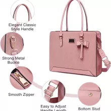 This tote bag isn’t just another laptop carrier – it’s a fashion statement. Made from premium waterproof PU leather, it ensures your essentials stay protected against unexpected spills and weather. The sophisticated woven texture and detachable bowknot add a touch of elegance, while the reinforced bottom with rivets keeps your bag secure and long-lasting.